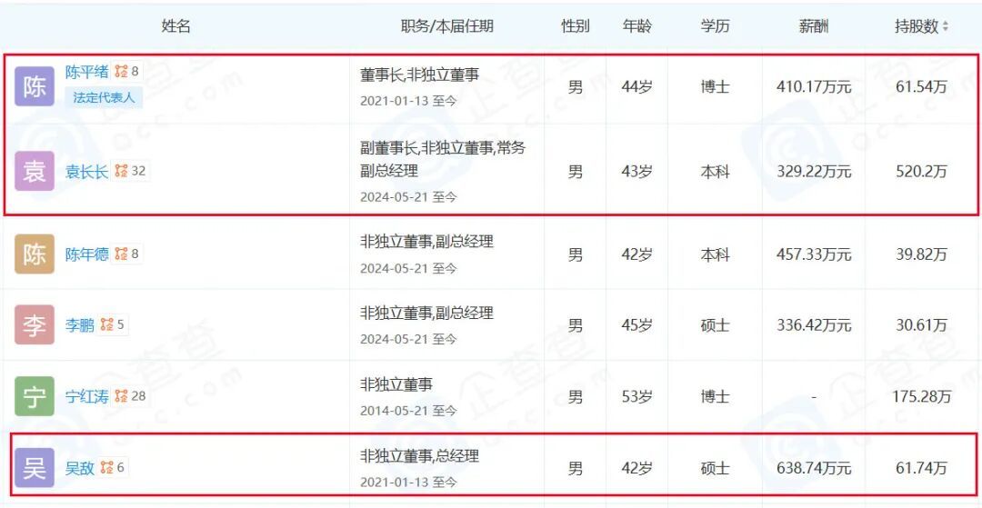 同期,袁志敏之子袁长长,也在高管序列中,担任副董事长、副总司理,年薪约330万元。袁令郎2009年便参预进修,作念过业务司理、营销副总等职位,作风较为低调。