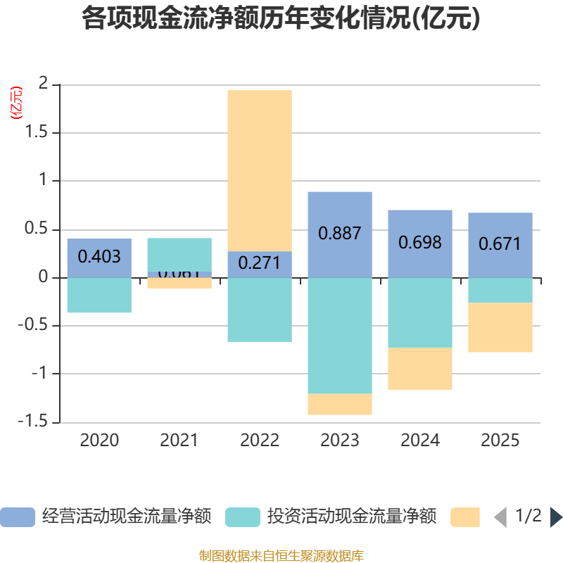 遏抑2025年,公司筹画步履现款流净额为6705.52万元,同比着落3.9%;筹资步履现款流净额-5130.8万元,同比减少771.8万元;投资步履现款流净额-2620.99万元,上年同时为-7280.83万元。