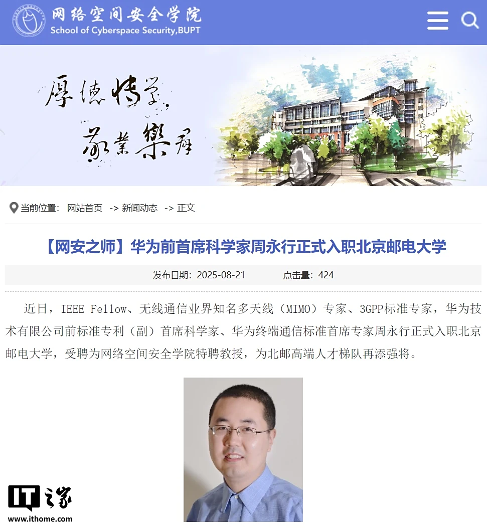 IT之家 8 月 28 日讯息,据北京邮电大学收罗空间安全学院官网 8 月 21 日讯息,IEEE Fellow、无线通讯业界著名多天线(MIMO)群众、3GPP 尺度群众,华为时期有限公司前尺度专利(副)首席科学家、华为末端通讯尺度首席群众周永行崇敬入职北京邮电大学,受聘为收罗空间安全学院特聘素质。